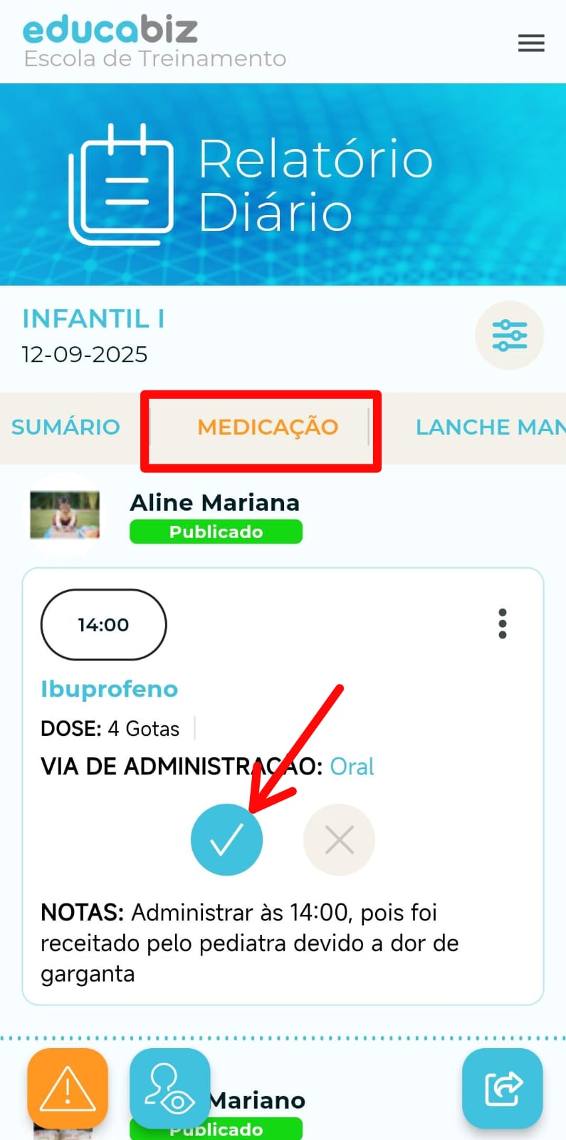 As informações registradas no item “Medicação” também estarão disponíveis no Relatório Diário, no campo específico de medicação. Nessa seção, os colaboradores poderão registrar de forma prática se o aluno “Tomou” ou “Não Tomou” a medicação em cada dia, garantindo o acompanhamento no cuidado do aluno.
