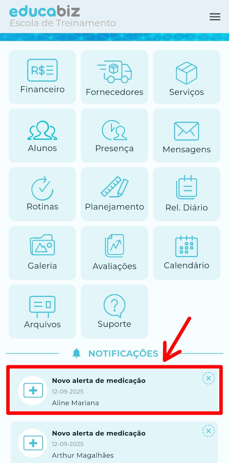 Para acompanhar os avisos de medicação criados pelos Responsáveis ou pelos Colaboradores, basta acessar a tela inicial do aplicativo. No campo “Notificações”, e encontrará todas as comunicações recebidas, incluindo os alertas de medicação.