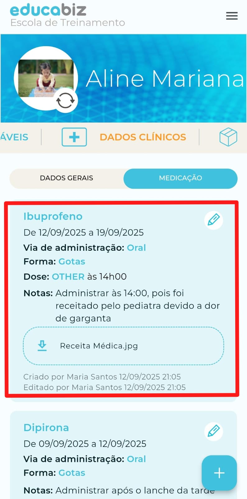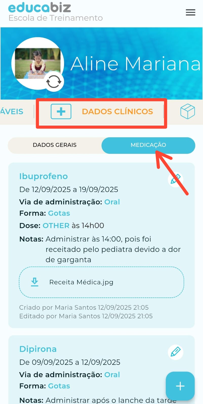 Em seguida, o usuário será automaticamente direcionado para o cadastro do aluno, na aba Dados Clínicos, especificamente no item “Medicação”.