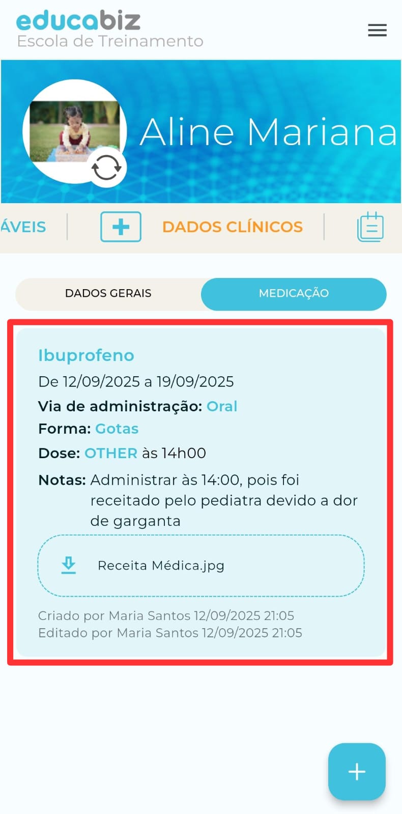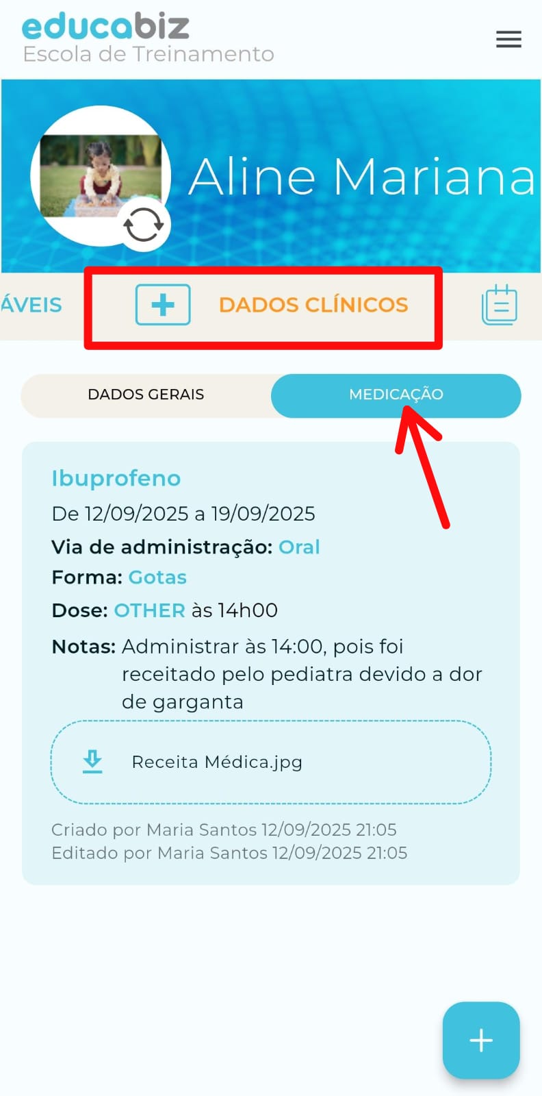 Em seguida, o usuário será automaticamente direcionado para o cadastro do aluno, na aba Dados Clínicos, especificamente no item “Medicação”.