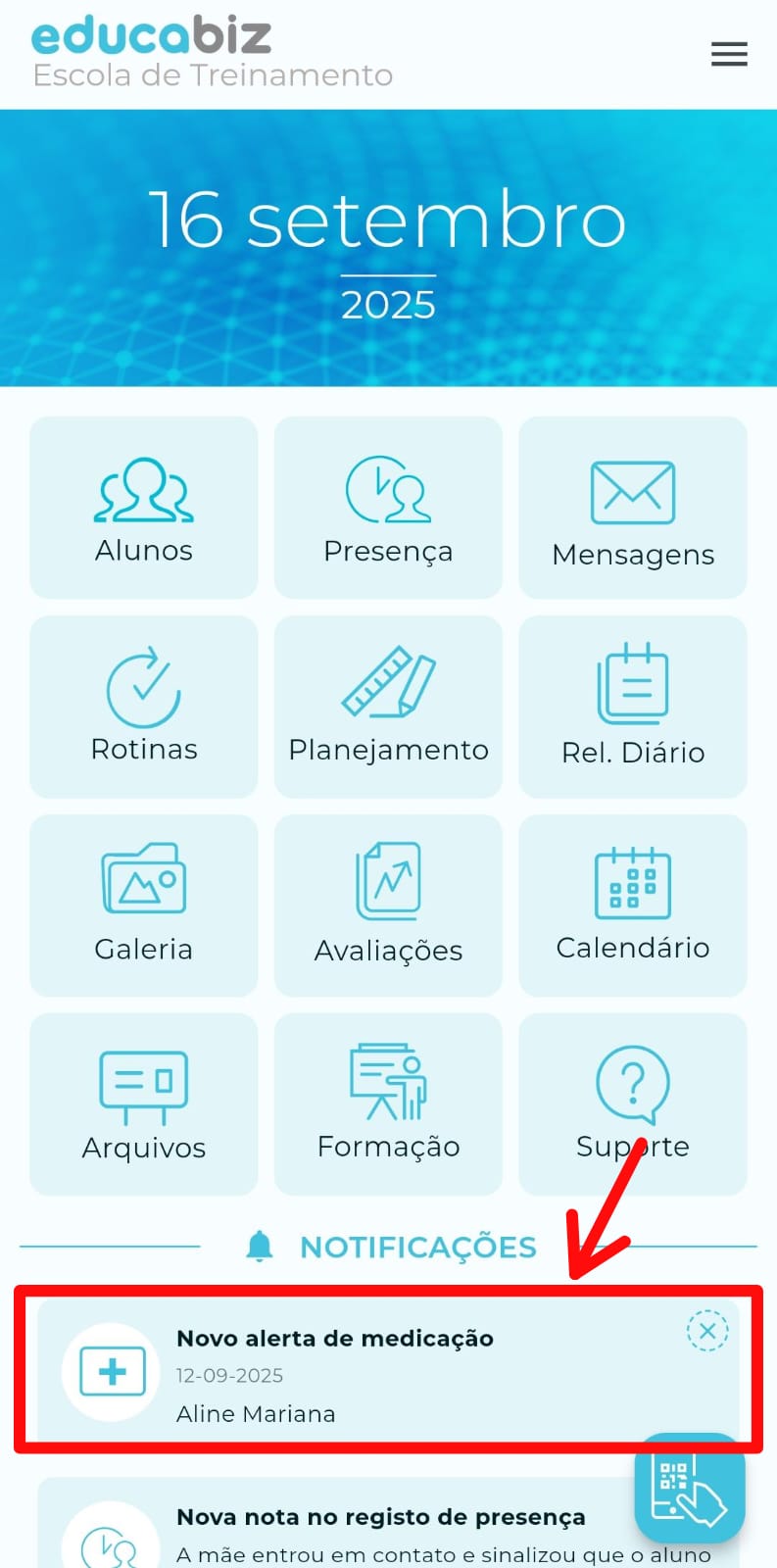 Para acompanhar os avisos de medicação criados pelos Responsáveis ou pelo usuário Administrador, basta acessar a tela inicial do aplicativo. No campo “Notificações”, o colaborador encontrará todas as comunicações recebidas, incluindo os alertas de medicação.