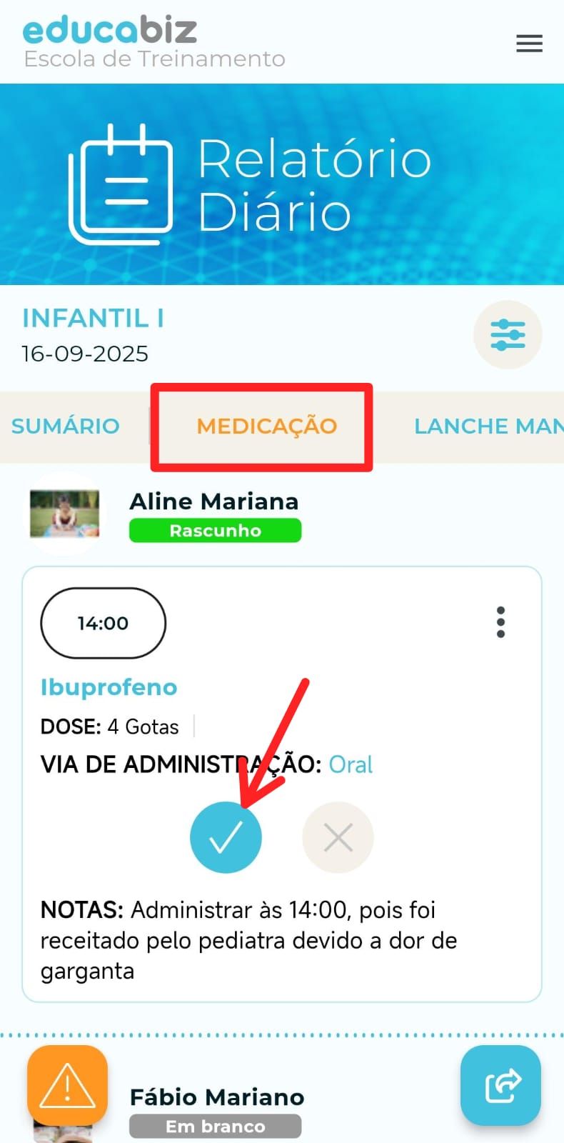 As informações registradas no item “Medicação” também estarão disponíveis no Relatório Diário, no campo específico de medicação. Nessa seção, os colaboradores poderão registrar de forma prática se o aluno “Tomou” ou “Não Tomou” a medicação em cada dia, garantindo o acompanhamento no cuidado do aluno.