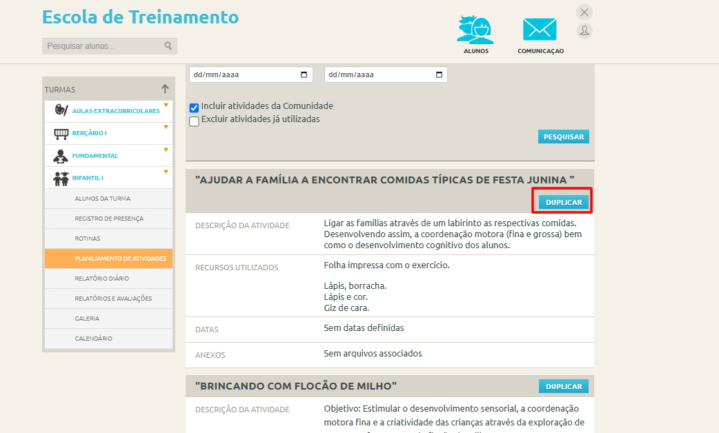 Em seguida, será possível visualizar as atividades disponibilizadas por outras instituições, e caso encontre uma atividade interessante, clique em > Duplicar.