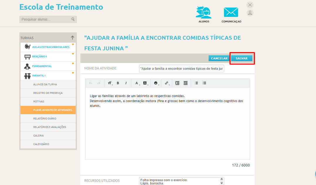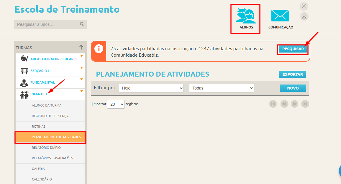 Para pesquisar atividades na Comunidade Educabiz pelo computador, acesse o menu superior Alunos > no menu lateral da turma desejada, clique em Planejamento de Atividades > e clique no botão de Pesquisar.