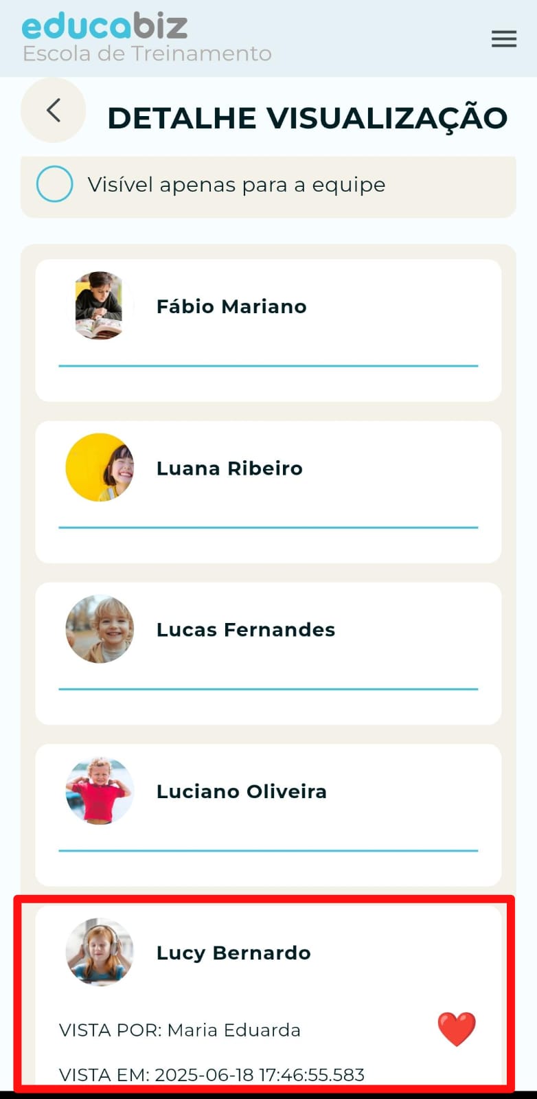 Será direcionado para a tela de "Detalhe de Visualização", onde poderá observar os responsáveis pelos alunos associados à foto ou vídeo que visualizaram, além de verificar se também reagiram clicando em algum emoji.