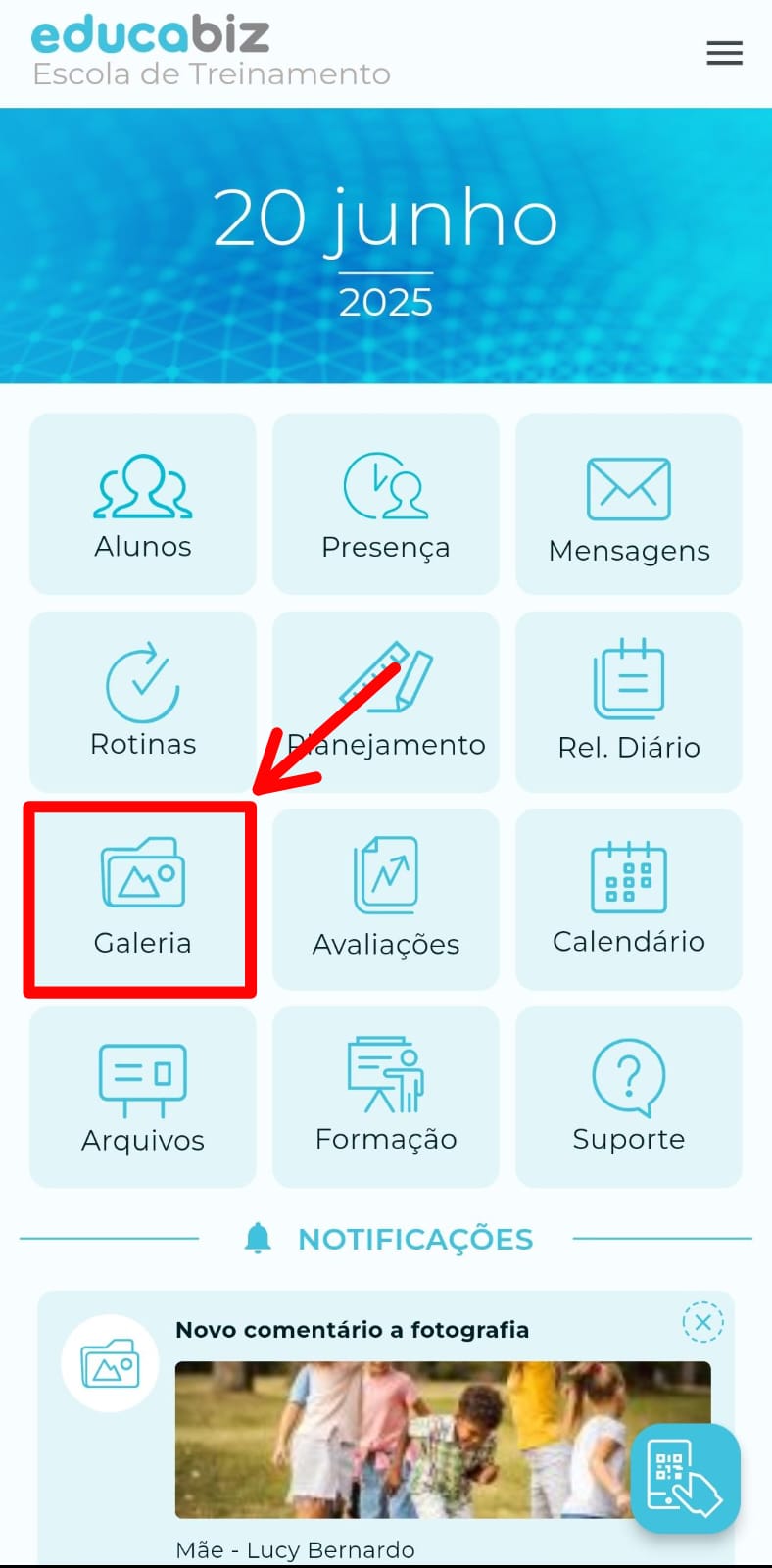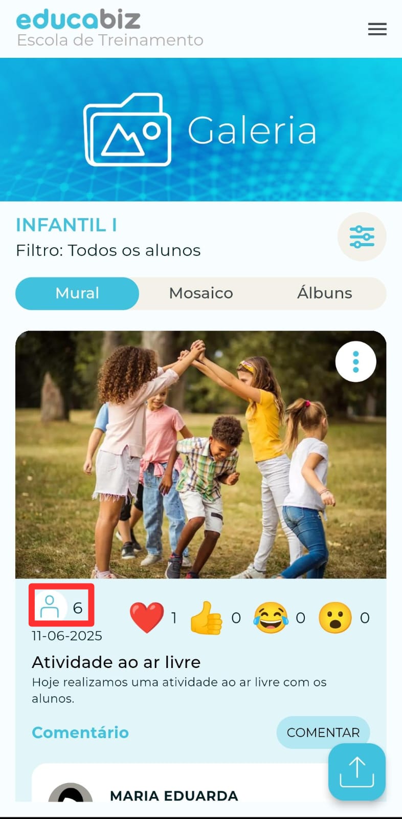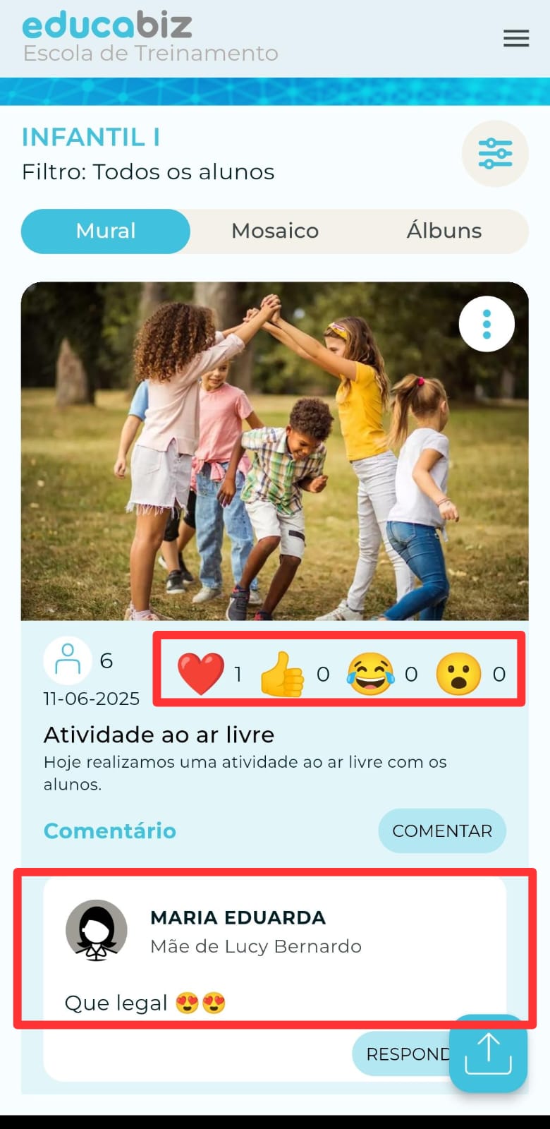 Ao retornar para a tela inicial da Galeria, abaixo da foto ou vídeo, será possível visualizar a quantidade de reações e os comentários realizados pelos responsáveis.