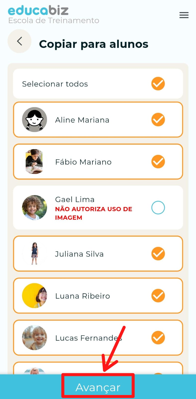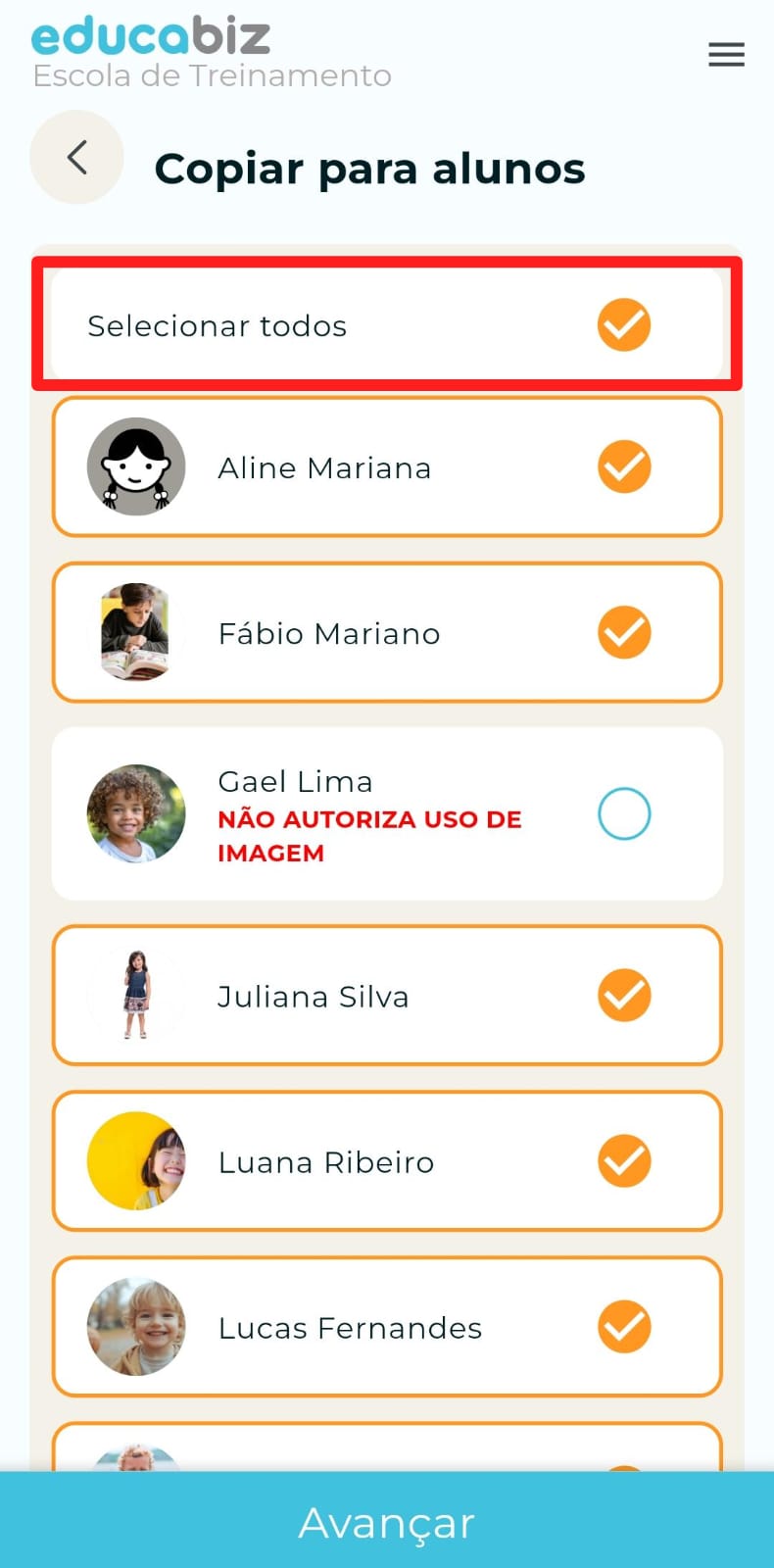 Escolha quais alunos a foto ficará associada ou, se for para todos, selecione a opção "Selecionar Todos".