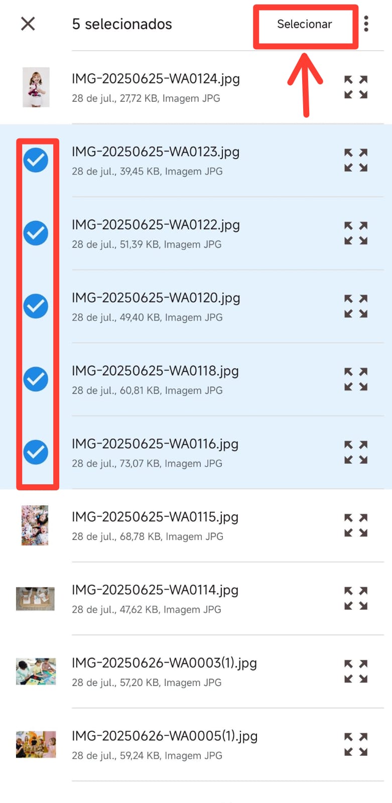 Escolha as fotos e vídeos que deseja publicar, e clique no botão > Selecionar.