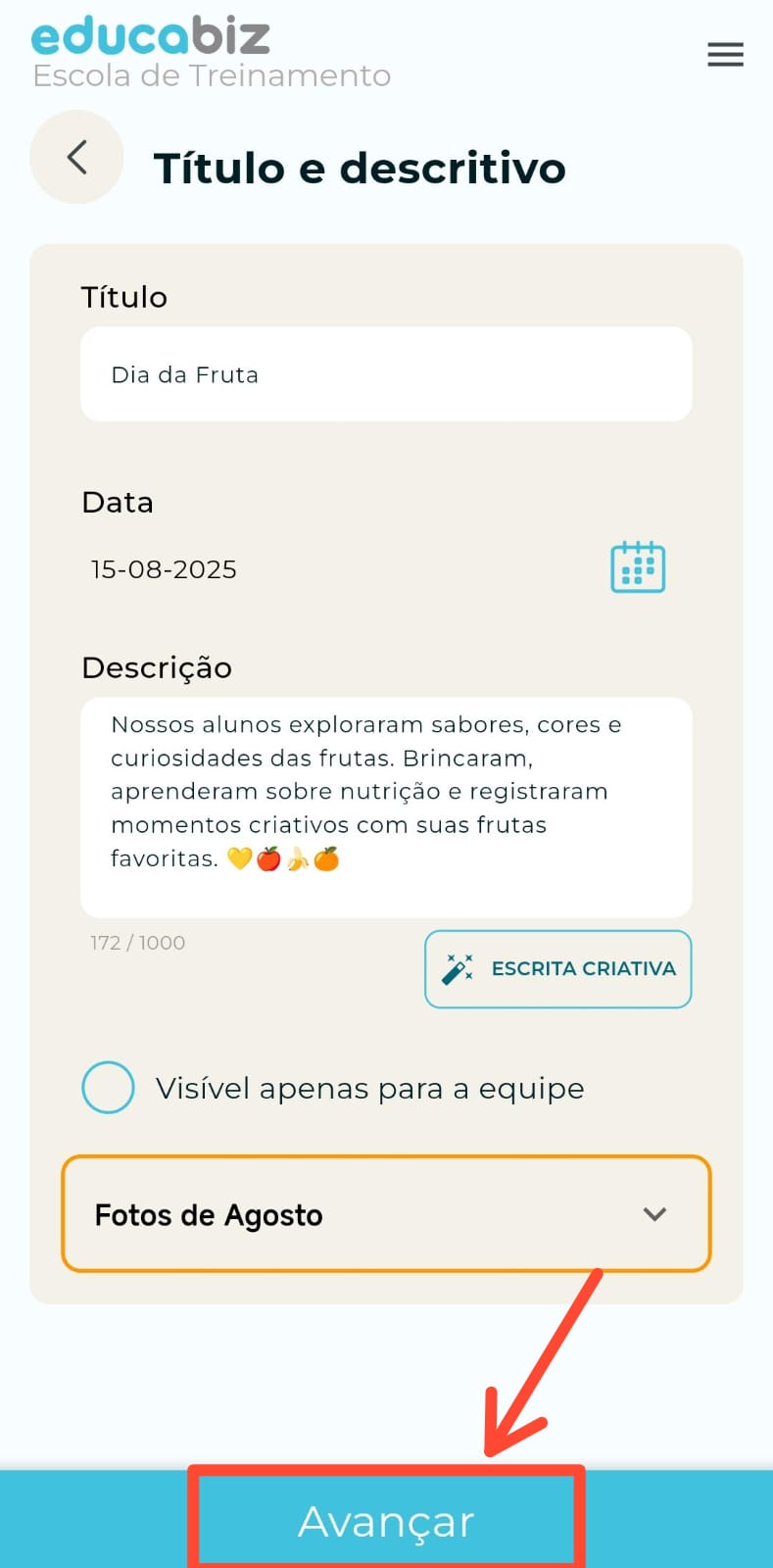 Pode também escolher se as fotos que vai importar serão apenas para registro pedagógico (observações pessoais) ou se deseja compartilhar com as famílias.